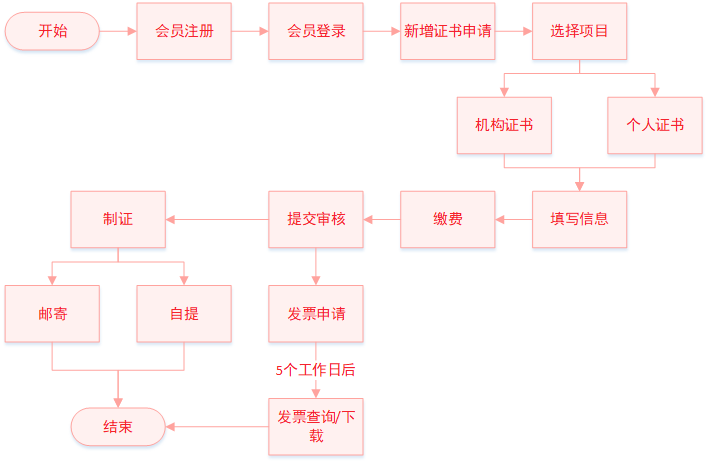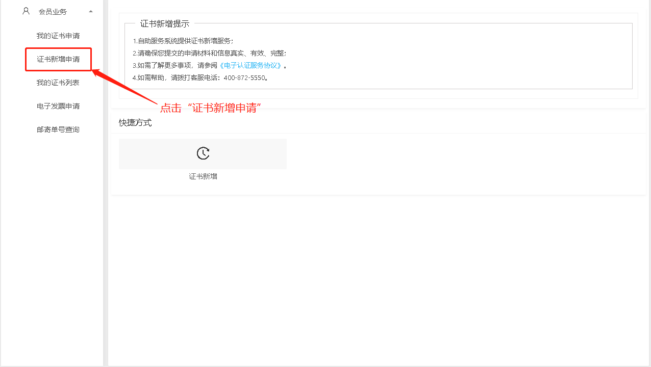 步骤1:完成会员登录后,进入会员主页,在“会员业务”下,点击“证书新增申请”。