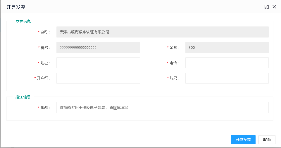 步骤6:审核通过后,即可在线申请发票信息,天津滨海CA负责在5个工作日内开具电子普票。用户可以在网站上查询进度和下载电子发票,也可以在预留的推送邮箱中查找发票邮件。
