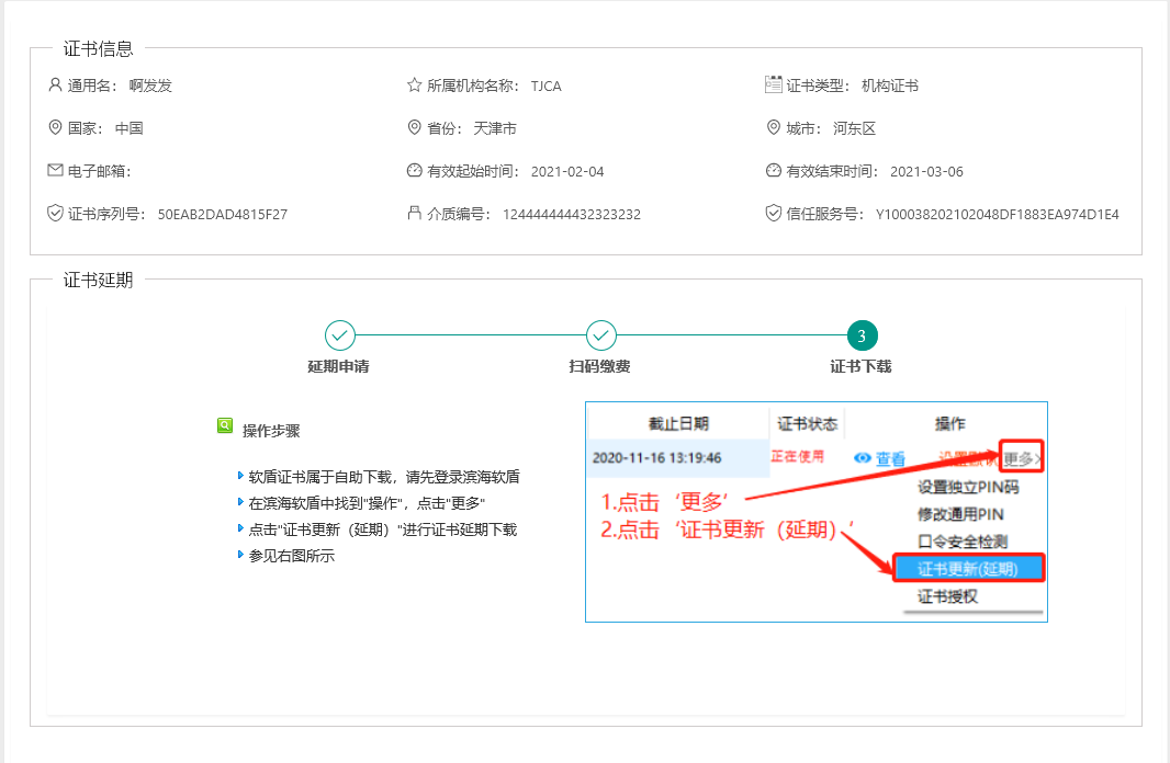 步骤4:根据提示操作步骤完成下载后,重新登录即可查看完成延期业务后的证书。