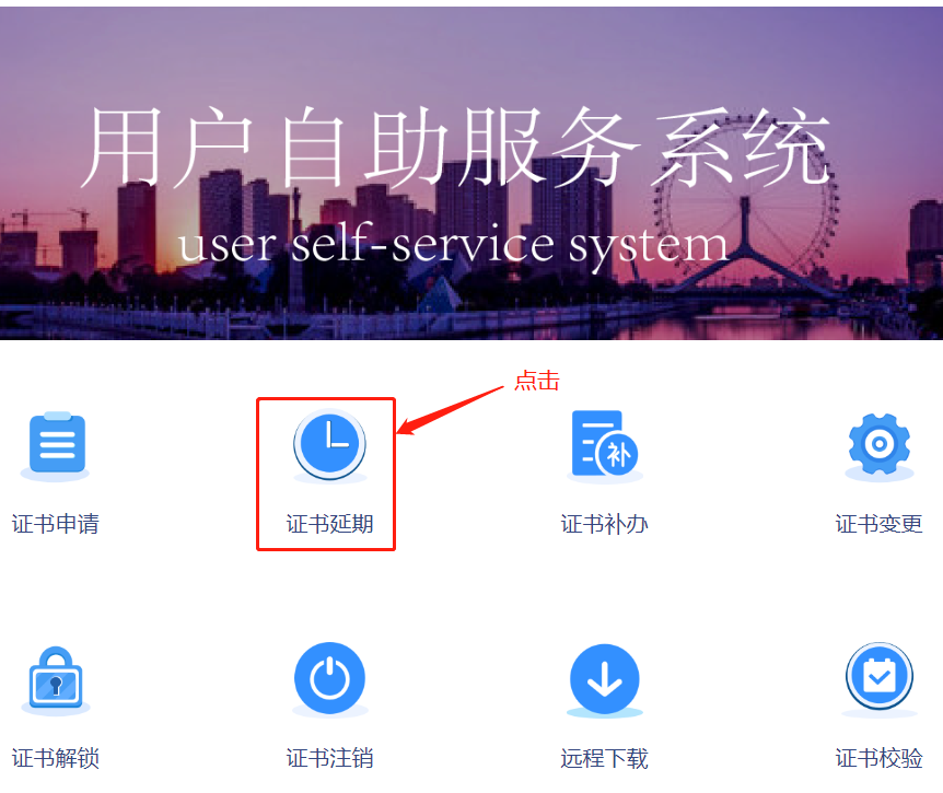 步骤1:在自助服务系统主页导航栏里点击“证书延期”,并选择APP扫码登录。