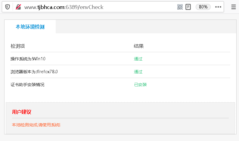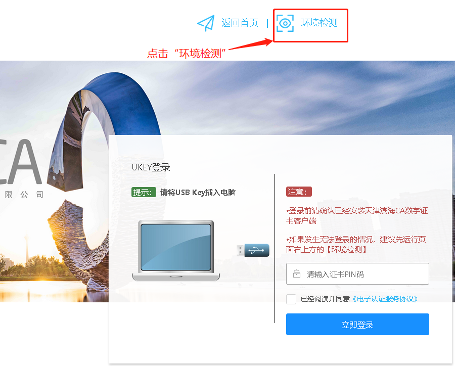 步骤1:在本网站使用过程中,当插入KEY出现无法登录或无法识别的情况,可以优先进行环境检测,系统会自动验证客户端环境是否满足本网站运行要求,如果客户方未通过环境监测,请根据环境检测提示更新系统、切换浏览器或安装正确版本的滨海ca证书助手。