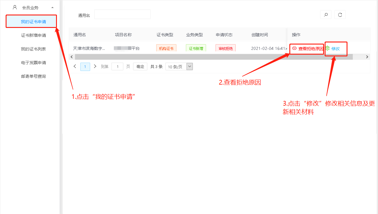 步骤1:审核未通过的证书可以进入“我的证书申请”进行查看