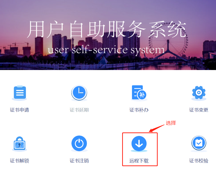 注:本功能仅用于滨海CA客服处理远程证书下载业务。 步骤1:在自助服务系统主页导航栏里点击“远程下载”并选择“UKey登录”。