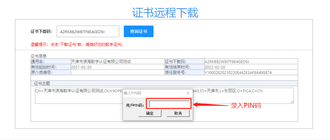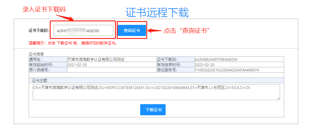 步骤3:插入KEY,录入证书下载码,点击“查询”即显示证书信息。确认证书信息无误后,点击“下载证书”。