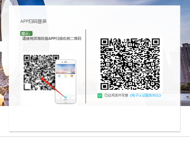步骤3:跳转登录页后,请用滨海软盾APP扫码右侧二维码,如下图: