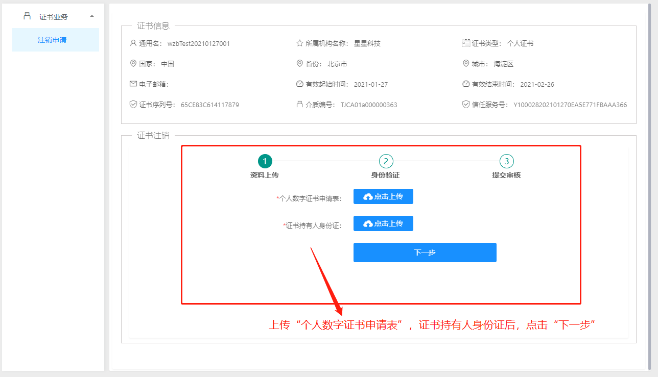 步骤1:浏览器打开系统首页,点击“证书注销”,如下图: