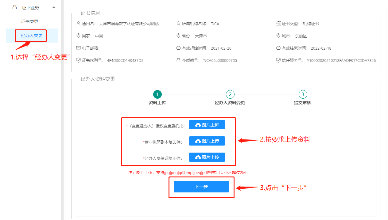 步骤3:选择“经办人变更”,按要求上传资料后点击“下一步”