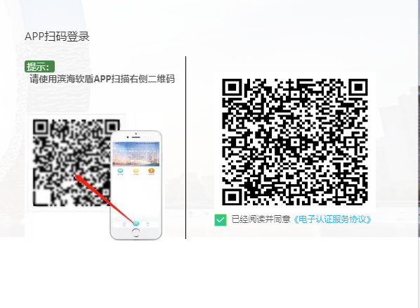 步骤2:使用手机端APP“滨海软盾”,扫面二维码后录入PIN码即可登录。