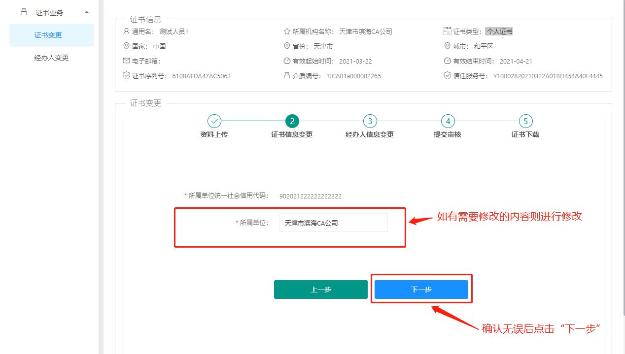 步骤4:证书信息如有需变更内容则进行相应变更,确认无误后点击“下一步”