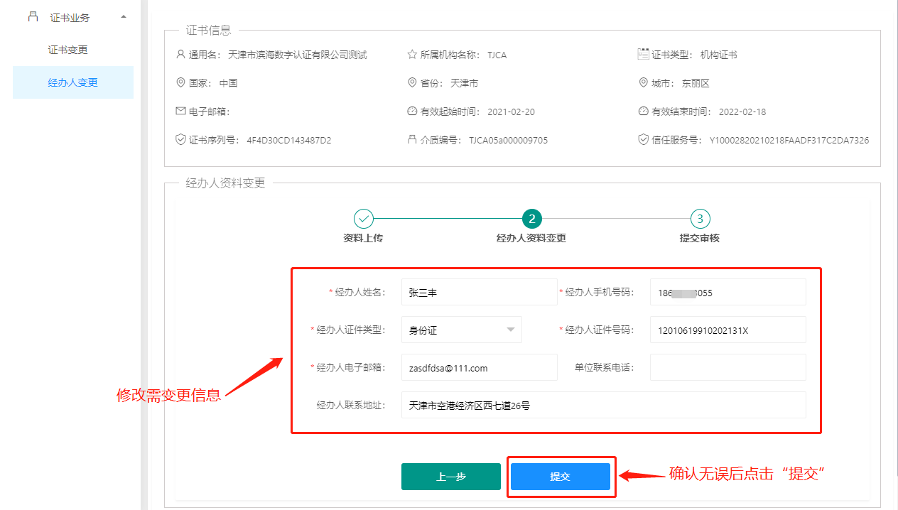 步骤4:修改需变更信息,确认无误后点击“提交”