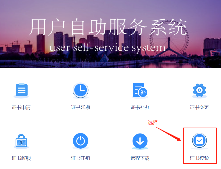 步骤1:用于检测和校验数字证书的完整性和正确性。首先在自助服务系统首页导航栏里点击“证书校验”并选择“UKey登录”。